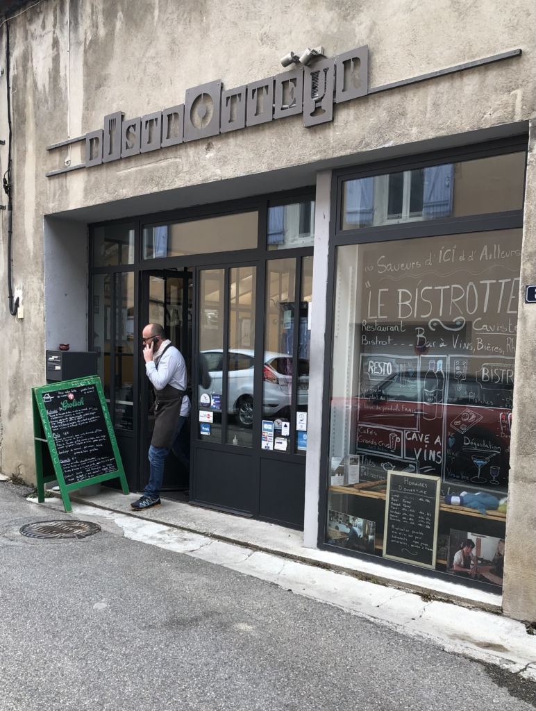 Ik zat naast een tafeltje met vier nederlanders, twee stellen die elk een chambre d’hôte uitbaten. Beide al zo’n 15 jaar. Het ene stel heeft een chambre d’hote in Nyons. (www.dessens-nyons.com). Dat ziet er goed uit. Het andere stel vertelde een horror story. Hun huis, in de buurt van Die, is in twee delen gebouwd en dat verzakt nu. Er moeten serieuze aanpassingen aan de fundering gedaan worden, maar bedrijven reageren niet eens op een offerte aanvraag. Ze willen graag verkopen maar niemand wil het kopen. Nou. Ja, dat heeft niks met het restaurant te maken.